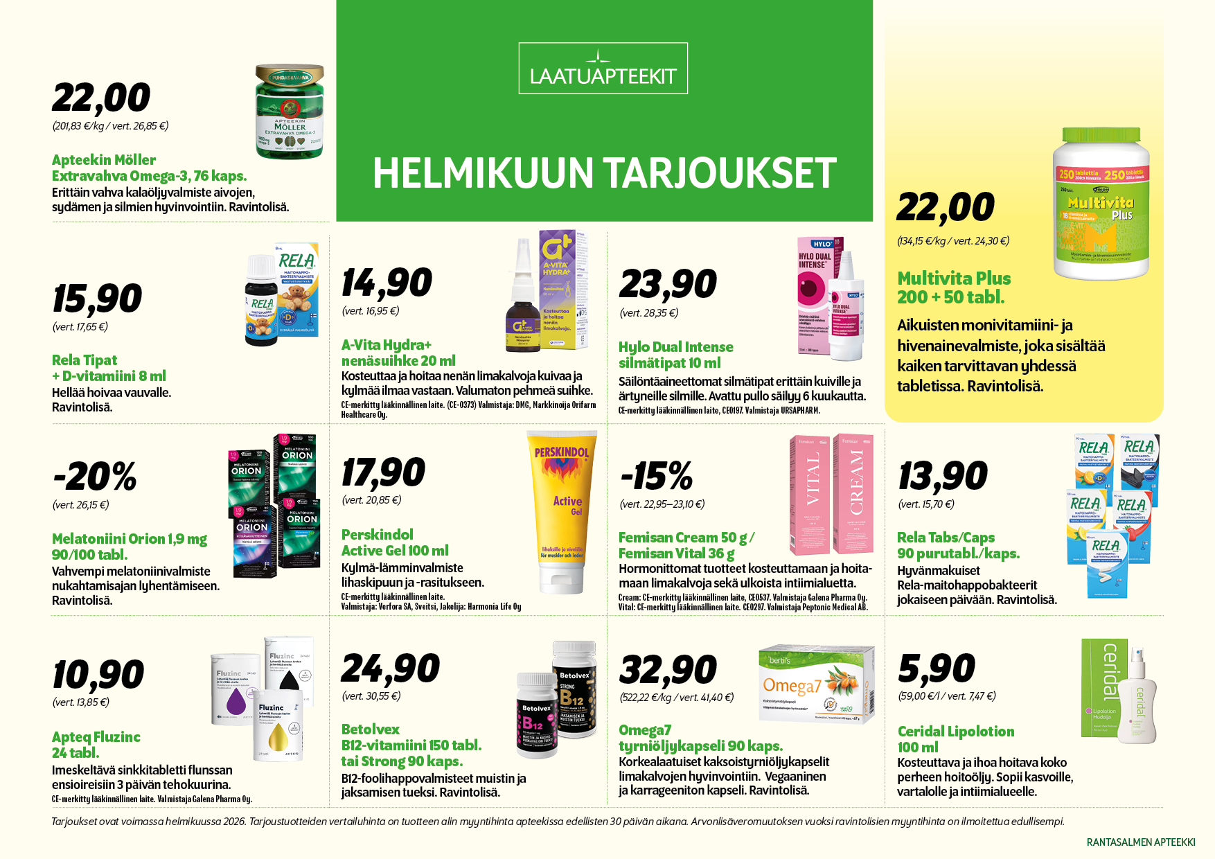 Tarjoukset Tule käymään Kylätie 21 58900 Rantasalmi Sijainti kartalla > Olemme avoinna Ma-pe klo: 9-17La klo: 9-13 Ota yhteyttä 0400 338 884 rantasalmenapteekki (at) apteekit.net